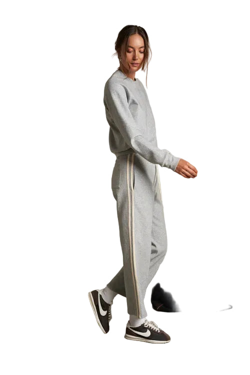the claud pant is our take on the modern travel track pant. easy, drapey, and finished with two neutral colored stripes down the side seam for that subtle retro touch. made in our soft cotton-poly-spandex blend, it moves with you and keeps its shape, whether you're sprinting through terminals or settling in for a long ride.