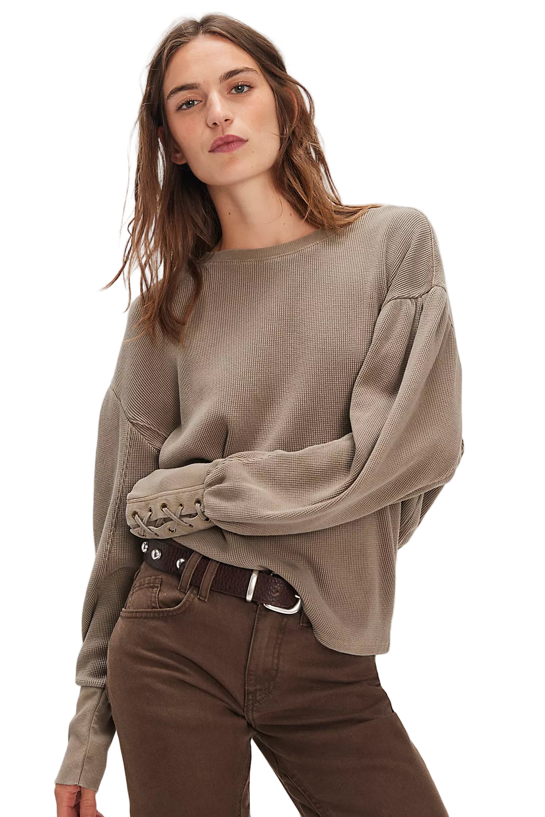 Lace-up details adorn the cuffs of this laidback long sleeve from We The Free, featured in a classic thermal fabrication with voluminous sleeves for added dimension.